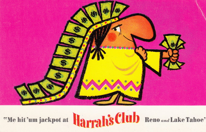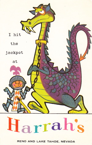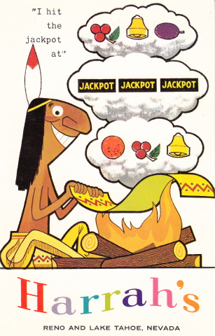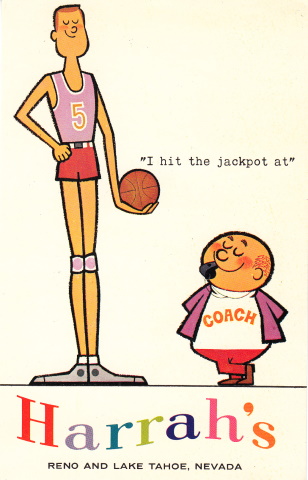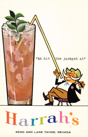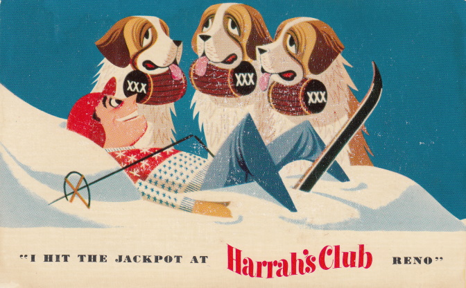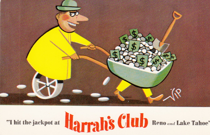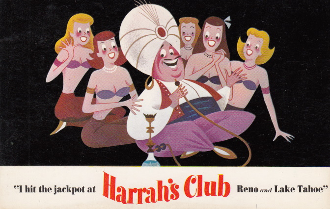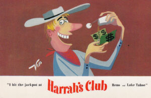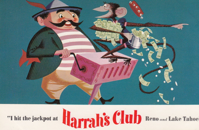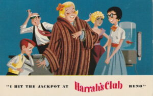 Sometime in 1958, the gambler switched to Reno’s Thomas C. Wilson Advertising Co. One of the agency’s ad campaigns for Harrah’s was the “I won a jackpot” postcards. Here are some of the first ones circulated. (Warning: Much of the content is politically incorrect and offensive today.)