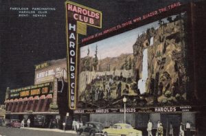 Gambling advertising was illegal at the time, but that didn’t stop Harolds Club. In fact, it launched the industry’s first expansive advertising campaign in the 1940s, which turned the place into the best-known casino in the world in the 1950s. Billboards showed a cartoon-like scene of a character heading for the Reno establishment in a comedic way, like by river raft, with the message: Harolds Club or Bust. At the peak, these enticements appeared in 45 states and worldwide.