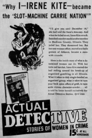 “I’ve got a lot of axes — about a dozen of them — and I’m not going to quit until every slot is out of the city,” she said (Nevada State Journal, Feb. 15, 1938).Kite also had informed the newspaperman that in Alton numerous syndicate-operated gambling places already should’ve been closed but hadn’t been because no officer would serve the warrants. She’d estimated that about 14 of these warrants, all legitimate and signed by a judge, were on file; the reporter looked into the matter and confirmed the total to be 17.