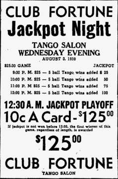 Owner Robert Feder debuted Club Fortune on May 28, 1937 after spending about $125,000 ($2.2 million today) on remodeling, furnishings, equipment, gambling licenses and advanced rent. He’d divided the space, on the corner of Second and Center streets,* previously a store, into two large, high-ceilinged, connected rooms. The one to the west, boasting rosewood paneling and blue carpeting, contained the games of chance, a bar and dining room. The east room housed the tango salon.